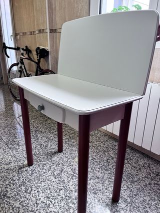Mesa plegable con un diseño moderno y funcional. - Patas de metal morado oscuro desarmables - Tablero blanco de madera medidas: 85x80 abierto Cerrado 80x 42 Alto 78 Peso 20Kl como nueva muy poco uso