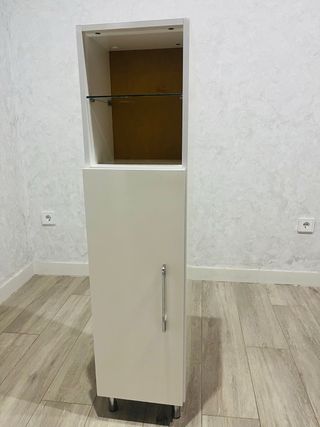 Mueble de baño alto y estrecho, con un diseño moderno y elegante. - Acabado en color blanco. - Estante de cristal. - Puerta inferior con tirador metálico.