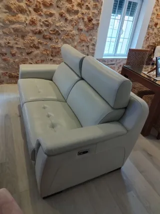 Sofá de tres plazas en perfecto estado, casi sin uso. Su diseño moderno y elegante aportará un toque de distinción a tu salón. - Tapicería de piel de alta calidad. - Color blanco neutro y luminoso. - Estructura robusta y cómoda.