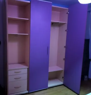 Armario de gran capacidad para habitación de matrimonio. Combina paneles de madera clara con puertas en color morado. - Cuatro puertas de acceso. - Tiradores metálicos. - Diseño moderno y funcional.