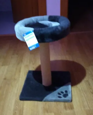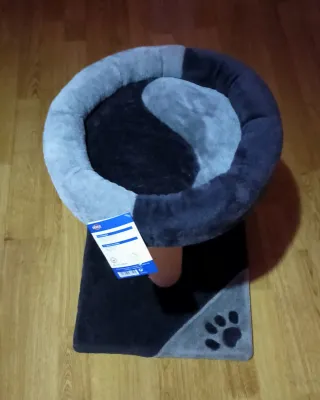 Cama para gato con poste rascador. El diseño combina tonos grises y negros. - Base cuadrada. - Plataforma superior acolchada. - Poste forrado para rascar.