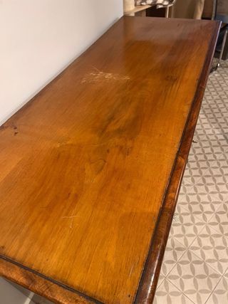 Mesa antigua en buen estado con algún pequeño golpe por lo demás todo genial, además está recién embarnizada