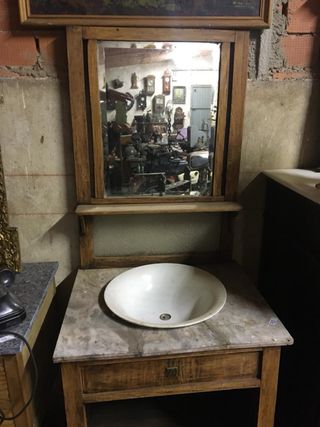 Mueble de entrada clásico antiguo de madera con encimera de mármol y espejo acorde al mueble. en buen estado, ideal para usar tal cual o restaurar en proyecto vintage. Estructura firme y materiales de calidad. Recogida en mano en zona Plaza San Francisco (Zaragoza). (Tiene un tirador roto ver fotos)