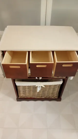 Nuevo a estrenar. Entrega en MANO. Este mueble planchero tiene un diseño muy funcional ya que se puede instalar en cualquier estancia de la casa y plegarse cómodamente una vez que haya sido utilizado. Esta hecho de madera oscura y sus acabados tienen un estilo industrial. Para llevar a cabo la tarea de planchado, cuenta con una tabla de planchar amplia forrada con una tela beige. Además dispone de tres pequeños cajones de madera simulando antiguos cabinetes de archivos, acorde con el aspecto industrial del conjunto. Incluye además, dos amplios cajones de mimbre de calidad, forrados con tela beige, y con gran capacidad.