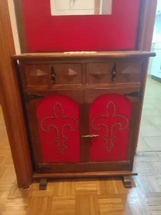 Mueble de entrada con un diseño clásico y detalles decorativos. - Estructura principal de madera. - Paneles frontales y detalles en tela roja. - Espejo central con marco de madera. - Tiradores metálicos en los cajones y puertas. -SE RECOGE EN LEGANÉS