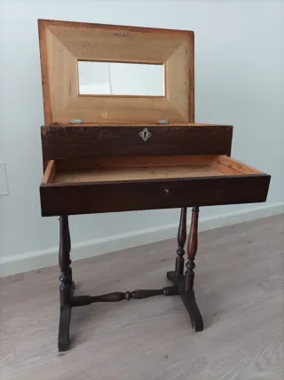 Mueble auxiliar antiguo de madera como costurero o joyero. Algunas notas de uso normales que le dan carácter y personalidad. Parte superior con espejo rectangular y cajonera en la parte interior. Medidas: alto 68 cm, frontal 54 cm y fondo 34,5 cm. Tenemos más artículos interesantes. Porcelana Limoges, Capeans, Rosenthal, La Cartuja de Sevilla, Wedgwood, Weimar, figuras Lladró, Nadal, Nao, Murano, espejos antiguos, maletas cuero antiguas grandes, quinqués antiguos, sillas antiguas restauradas y butacas.