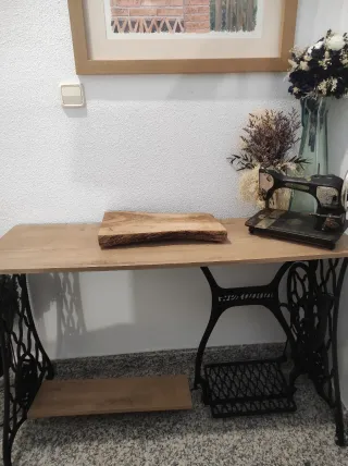 Preciosa máquina de coser Hexagon antigua que ha sido restaurada con esmero para convertirse en mueble de entrada .Un elemento decorativo único. - Base de metal con intrincados detalles. - Encimera de madera natural.