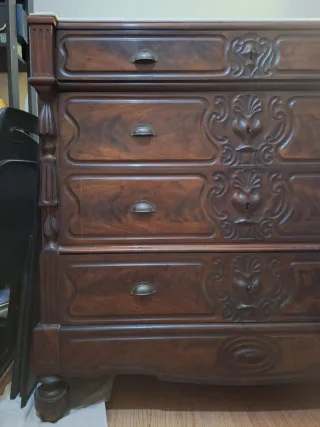 Cómoda de madera de estilo antiguo, en buen estado. - Diseño clásico con múltiples cajones. - Tiradores dorados ornamentados. - Acabado brillante en tono marrón oscuro.