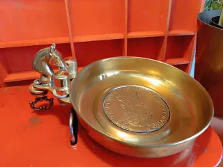 Este limonaire de bronce antiguo presenta un diseño único con un detalle de caballo. - Acabado en tono dorado. - Diámetro plato 19 cm sin contar el caballo. - Alto 11 cm con el caballo. - Peso 690 gramos.