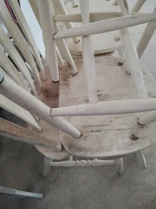 Conjunto de sillas de roble macizas de estilo americano antiguo. Son piezas únicas con un encanto especial. - Diseño clásico de respaldo curvo y barrotes verticales. - Asientos redondos. - Patas robustas y estables.