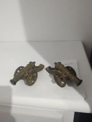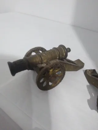 Conjunto de dos cañones decorativos antiguos. - Fabricados en metal con acabado en bronce. - Diseño detallado con ruedas.