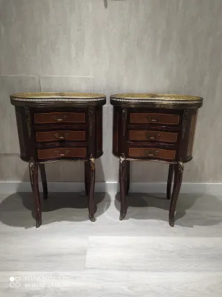 Para amantes de antiguedades. Dos mesitas de noche antiguo, de Luis XV diseño ovalado con patas curvas y detalles dorados. - Encimera de mármol. - Cuerpo de madera con incrustaciones. - Tiradores ornamentados. El precio es de unidad.