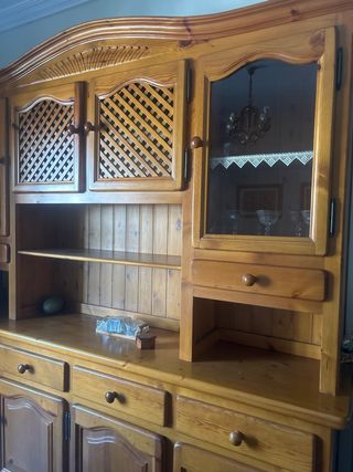 Precioso mueble de salón de madera maciza, en color marrón. Se encuentra en buen estado. - Diseño clásico con vitrinas y cajones. - Ideal para almacenar vajilla y otros objetos. - Perfecto para darle un toque rústico a tu hogar. - Dos puertas con entramado de rejilla.