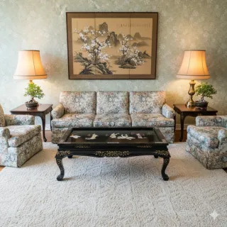 Elegante sillón con un diseño clásico y detalles ornamentales. - Tapicería con estampado floral. - Estructura de madera oscura. - Respaldo y asiento acolchados.