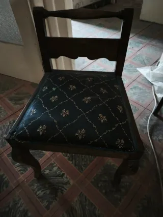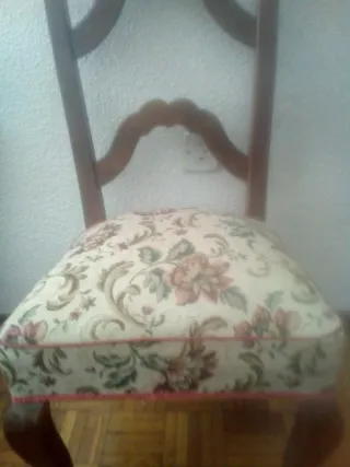 Elegante silla antigua con un diseño clásico. - Estructura de madera resistente. - Tapizado de tela con estampado floral. - Tonos marrones y multicolor en el diseño.