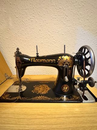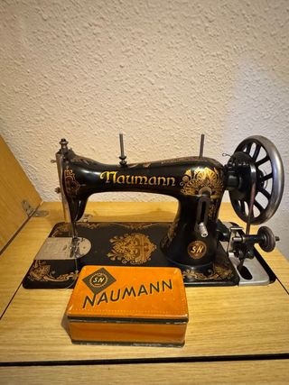 Preciosa máquina de coser antigua de la marca Naumann, un objeto decorativo con mucho encanto. - Diseño clásico en negro y dorado. - Fabricada en metal y madera.