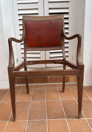 OPORTUNIDAD!! Silla despacho en nogal antigua, elegante con formas organicas. Originalmente asiento y respaldo en piel rojo y detalles de tachuelas cobre. Preserva buena estructura. Una pieza funcional y con historia que merece un buen restauro. PARA RESTAURAR