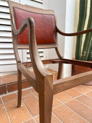 Elegante silla antigua con un diseño curvo y patas cruzadas. - Fabricada en madera oscura. - Asiento y respaldo con lamas. - Brazos redondeados.