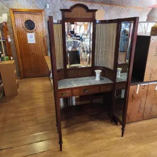 Elegante tocador de madera con detalles en mármol y cristal. - Tres espejos, uno central y dos laterales abatibles. - Encimera de mármol veteado. - Cajones y puertas con tiradores metálicos. - Adorno superior tallado. - Años 20