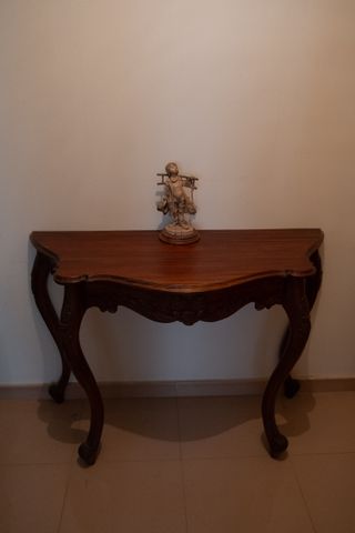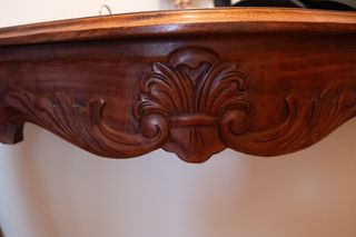 Elegante mesa consola de madera con un diseño clásico y ornamentado. Perfecta para dar un toque de distinción a tu hogar. - Patas curvas con detalles tallados. - Encimera con forma sinuosa. - Adorno central tallado en la parte inferior.