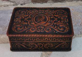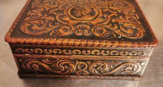 Antigua caja para tabaco, madera y cuero repujado. Medidas: 7cm x 13cm x 19cm.