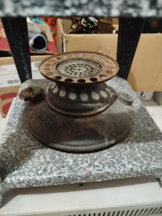 Brasero antiguo con un diseño rústico y detalles decorativos. ESCUCHO OFERTAS!!! - Base de piedra con acabado moteado. - Cuerpo de metal con adornos. - Parte superior con rejilla perforada.