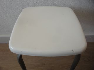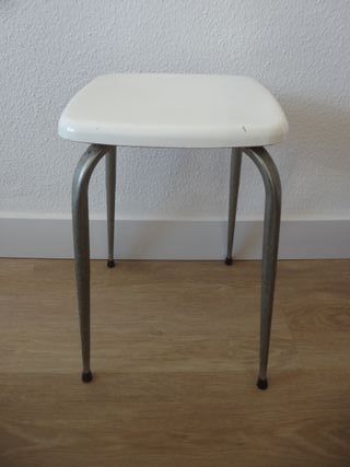 Se vende un taburete de cuatro patas en Granada capital por sólo 3 Euros. Asiento de madera en color blanco. Patas metálicas con tacos de plástico. Robusto, resistente y estable. Tiene algunos signos de desgaste en el asiento y evidentes marcas de óxido en las patas, pero se mantiene en perfecto estado estructural. Mide 27cm por cada lado y 45cm de alto. Fabricado en Huelva por TAMSA. Ganga económico barato oportunidad oferta segunda mano vintage retro rústico rural antiguo casa campo cocina silla asiento. ¡Entra en mi perfil para ver otros artículos interesantes! Soy vendedor 100% fiable (más de mil opiniones positivas).