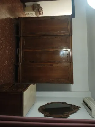 Armario de estilo antiguo con puertas talladas y tiradores metálicos. - Fabricado en madera maciza. - Diseño clásico con molduras. - Tiradores de metal con acabado envejecido. Armario antiguo de madera maciza en muy buen estado. Diseño clásico español con varias puertas, baldas, barra para colgar y cajoneras interiores. Muy espacioso y resistente. Ideal para dormitorio o vestidor. Fabricación de calidad, no es aglomerado. Solo recogida y desmontaje en el lugar.