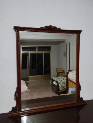 Elegante espejo antiguo con un marco de madera tallada. Su diseño le da un toque clásico a cualquier espacio. - Marco con detalles ornamentales. - Cristal biselado.