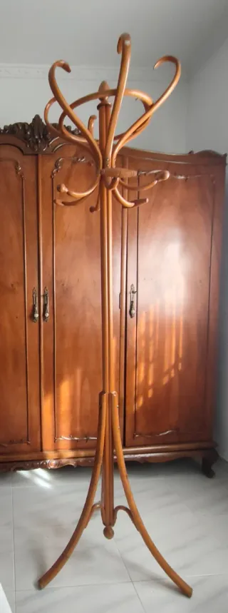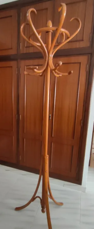 Elegante perchero de pie con un diseño clásico y funcional. - Fabricado en madera. - Cuenta con seis brazos para colgar abrigos, sombreros o bolsos. - Su base proporciona estabilidad.