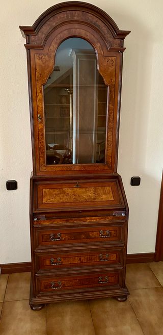 armario de madera de estilo vintage con un diseño alto y elegante. La sección superior tiene un gabinete con frente de vidrio y un acabado decorativo arqueado.Abajo, hay una sección con tapa abatible, con un detallado veteado de madera y una cerradura. La sección inferior consta de tres cajones espaciosos, cada uno adornado con asas de metal ornamentadas. La pieza de mobiliario descansa sobre pequeñas patas redondeadas y sus cálidos tonos de madera y diseño intrincado sugieren una estética clásica y antigua.