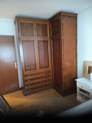 Armario ropero esquinero antiguo con diseño en L y cajonera integrada. Sus medidas son 248 cm de alto y 59 cm de profundidad. Madera maciza - Cajoneras, baldas y percheros - Medidas: 248alto 59 cm profundo 68 ala corta 108 ala larga Decoración con marquetería motivos geométricos Luis XIV Formas rectas robustas Neoclásico No ofertas No regateo No envío No marear