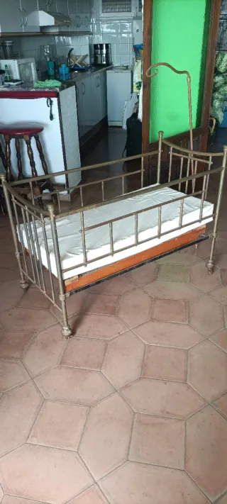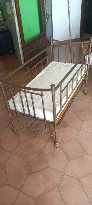 Preciosa cuna antigua con un diseño clásico. - Estructura principal de metal. - Detalles y base de madera. - Acabado en tonos dorados y marrones.