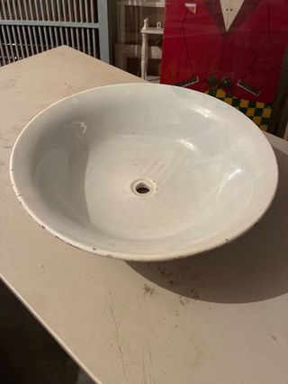 Lavabo antiguo con un diseño clásico y elegante. Su forma redonda y su acabado lo hacen una pieza única. - Material: Porcelana.