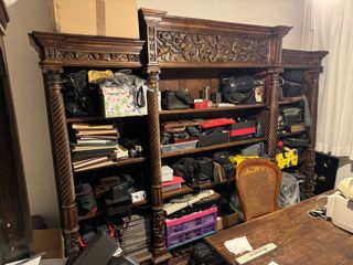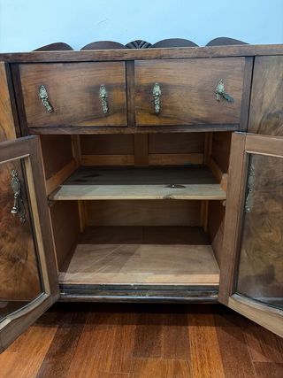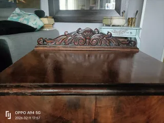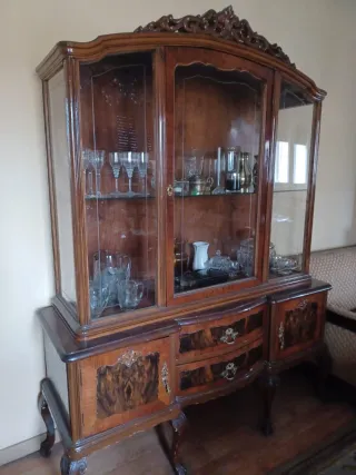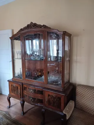 Mueble de salón de estilo antiguo, con un diseño clásico y elegante. - Combinación de madera oscura y detalles en cristal. - Múltiples compartimentos para almacenamiento. - Tiradores dorados. - Adorno decorativo en puertas superiores e inferiores. El mueble se encuentra en buen estado, tiene algún desperfecto en los cajones de abajo que hay que reparar, pero es un trabajo ideal para un manitas. El mueble se puede desmontar en 4 partes para hacer más fácil el traslado El mueble se encuentra en un pueblo de Almería
