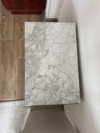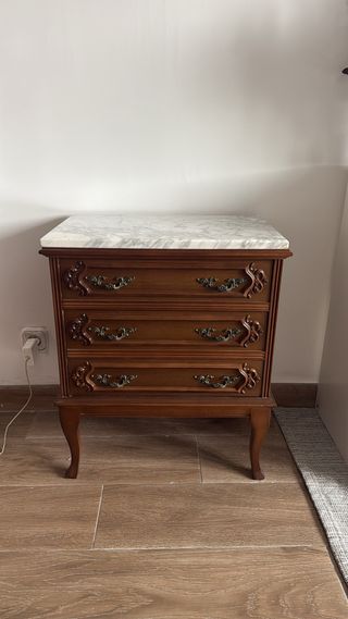 Elegante mesilla de noche antigua de madera maciza con tapa de mármol natural. Mueble de muy buena calidad, sólido y pesado, con cajones amplios y herrajes originales de estilo clásico. La tapa de mármol está en muy buen estado. Ideal para dormitorio, recibidor o como mueble auxiliar decorativo. Se vende por cambio de decoración. Precio negociable.