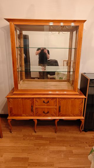 Elegante vitrina antigua con detalles en madera y cristal. - Diseño clásico con espejo interior. - Mueble de madera con cajones y puertas. - Patas curvas de estilo. - Ideal para exhibir colecciones. Vitrina elegante madera roble macizo acabado brillante, puertas cristal. 💎 3 estanterías cristal, cornisa tallada decorativa. 🪵 Base cajones inferiores funcionales tiradores latón original. 📏 Medidas exactas VISIBLE en FOTOS. ✨ Estilo clásico español: salón, comedor, recibidor, despacho Madrid profesional. Madera noble tratada barniz nitrocelulosa durabilidad 50+ años 🚚 A RECOGER A PARTIR 19 FEBRERO Madrid