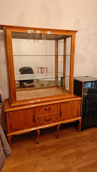 Mueble de salón de estilo clásico, ideal para dar un toque elegante a tu hogar. Se encuentra en buen estado. - Diseño con puertas de cristal y compartimentos interiores. - Acabado en tonos madera. - Amplio espacio de almacenamiento con cajones y armarios. Se regala mesa y 6 sillas