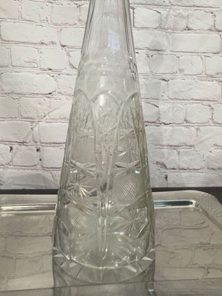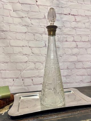 Elegante licorera antigua con un diseño intrincado. 44cm altura - Cuerpo de cristal transparente con grabados. - Base y cuello de metal dorado. - Tapón de cristal tallado. Bandeja, cristaleria, vajilla, mueble, bar, vintage, antigua, antiguo, antigüedades, vitrina, alacena, cristaleria, cubitera, hielera, vasos, copas, jarra, coctelera, vidrio, cristal, labrado, transparente, bandeja, fuente, centro de mesa, arreglo floral, baccarat, bacarat, bohemia, republica checa, siglo, xx, plata, oro, metal, metalico, plateado, dorado