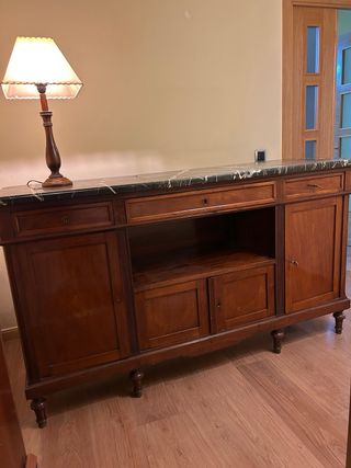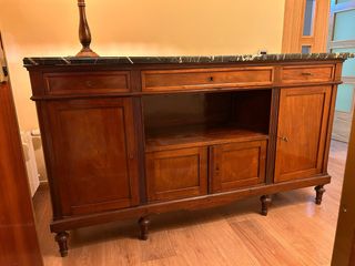Elegante aparador antiguo con una superficie de mármol y estructura de madera maciza. -Diseño clásico y robusto. - Encimera de mármol veteado. - Patas torneadas. (marmol quebrado, ultima foto)
