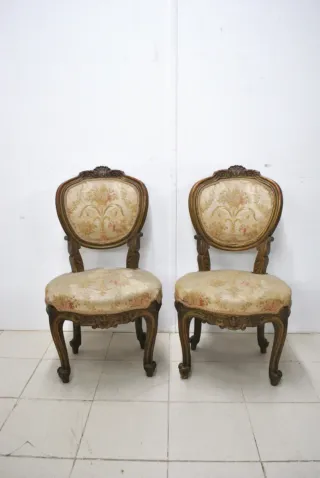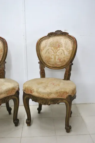 Conjunto de sillas antiguas con un diseño clásico. - Tapicería de tela con estampado floral. - Estructura de madera robusta.