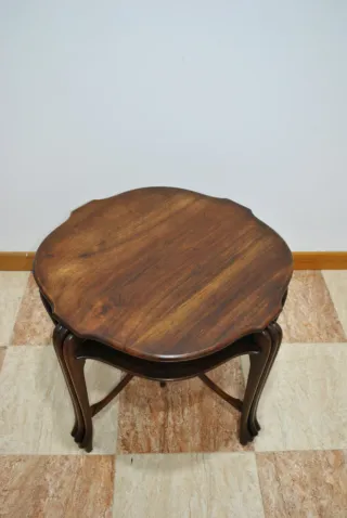 REF: 12135 – Precioso conjunto de mesa nido antigua compuesto por una mesa principal y tres mesas auxiliares encajables, realizadas en madera maciza en tono nogal oscuro. Destaca por su elegante diseño de líneas curvas, con sobre ligeramente moldurado de contorno ondulado y refinadas patas cabriole que aportan ligereza visual y distinción. La estructura presenta travesaños curvados en la parte inferior que refuerzan su estabilidad y realzan su carácter clásico. Medidas: 73 x 73 x 53 cm.