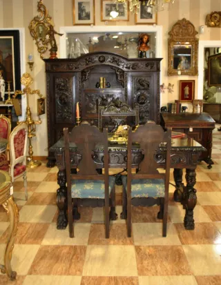 REF: 12069 – Espectacular despacho de inspiración renacentista, realizado en madera maciza tallada y ricamente ornamentado con escenas figurativas, motivos mitológicos y decoración vegetal en alto relieve. El conjunto está compuesto por una majestuosa librería–aparador de gran formato, mesa de despacho con patas talladas, sillón central y, pareja de sillones a juego. Cada pieza destaca por la profundidad y calidad de su talla artesanal, con querubines, escenas históricas en relieve y elementos decorativos de gran expresividad y movimiento. Interesados no duden en consultar medidas.