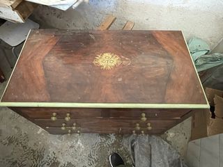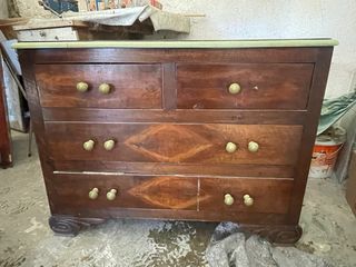 Cómoda antigua de estilo isabelino, restaurada y pintada en tono verde antiguo, con tapa original de mármol veteado en perfecto estado. Pieza muy decorativa y elegante, ideal para dormitorio, recibidor o salón. Combina muy bien tanto en ambientes clásicos como contemporáneos. ✨ Detalles: • Madera maciza • Tapa de mármol natural en excelente estado • 6 cajones • Restaurada y pintada hace unos años • Estilo isabelino Buen estado general. El cajon inferior no desliza con suavidad porque esta desajustada la tapa interior. Reparación sencilla. Recogida en mano en Chamartín