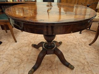 Elegante mesa redonda antigua con un diseño clásico. - Tablero de madera con veta marcada. - Base de pedestal con patas ornamentadas. - Acabado en latón en forma de garra Medida: diámetro del tablero 85 y 75cm de altura RECOGER EN MANO