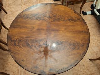 Elegante mesa redonda antigua con un diseño clásico y detalles tallados en el borde. Su superficie de madera presenta un veteado natural que le otorga carácter. - Diseño redondo. - Borde con detalles tallados. - Acabado rústico. 1,65 cm abierta