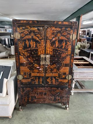 Armario antiguo con un diseño oriental detallado. Sus dos puertas presentan escenas pintadas a mano. - Acabado principal en negro con detalles dorados. - Herrajes metálicos. - Estilo oriental.
