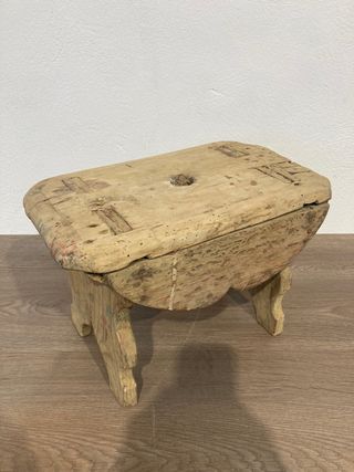 Banqueta de madera con un diseño rústico y antiguo, ideal para proyectos de restauración. Su estética desgastada le confiere un carácter único. - Piezas de madera con marcas de uso. - Detalles de pintura multicolor visibles. Alto 24. Largo: 37. Fondo 22