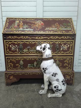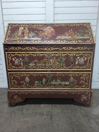 Instagram janoradeco Espectacular pieza. Antigua. Precioso escritorio oriental con detalles intrincados. Muy elaborado. Señales del paso del tiempo. Medidas totales 100 x 48 y 96 de alto. Abierto. 74 cms de fondo. - Diseño con escenas orientales pintadas. - Bordes y adornos dorados. - Tiradores metálicos con forma de león.