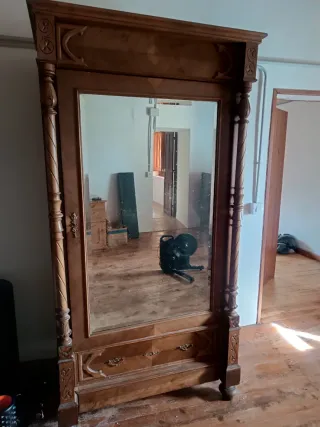 *SE REGALA* Mueble antiguo con un espejo grande y detalles decorativos. - Estructura de madera. - Espejo con marco de madera. - Cajones con tiradores ornamentados.